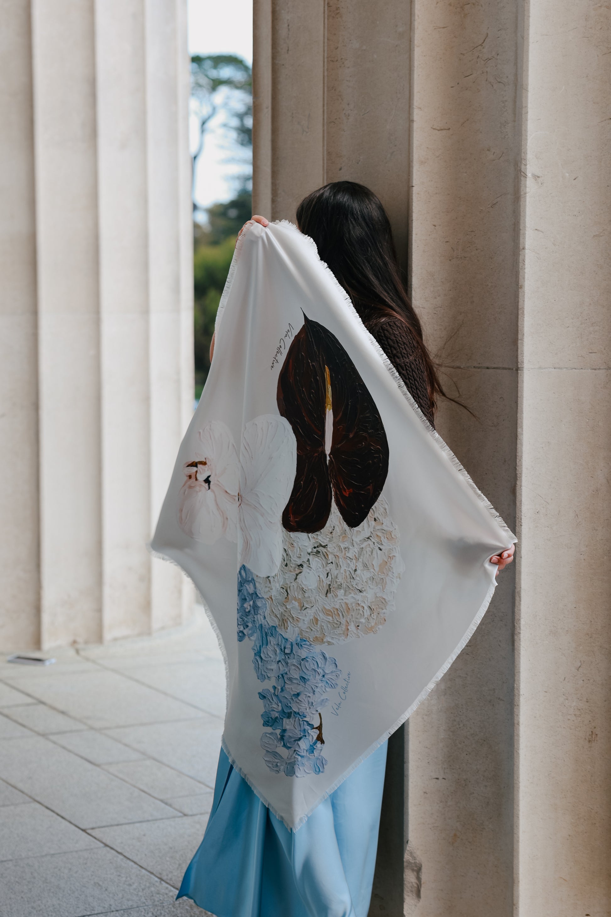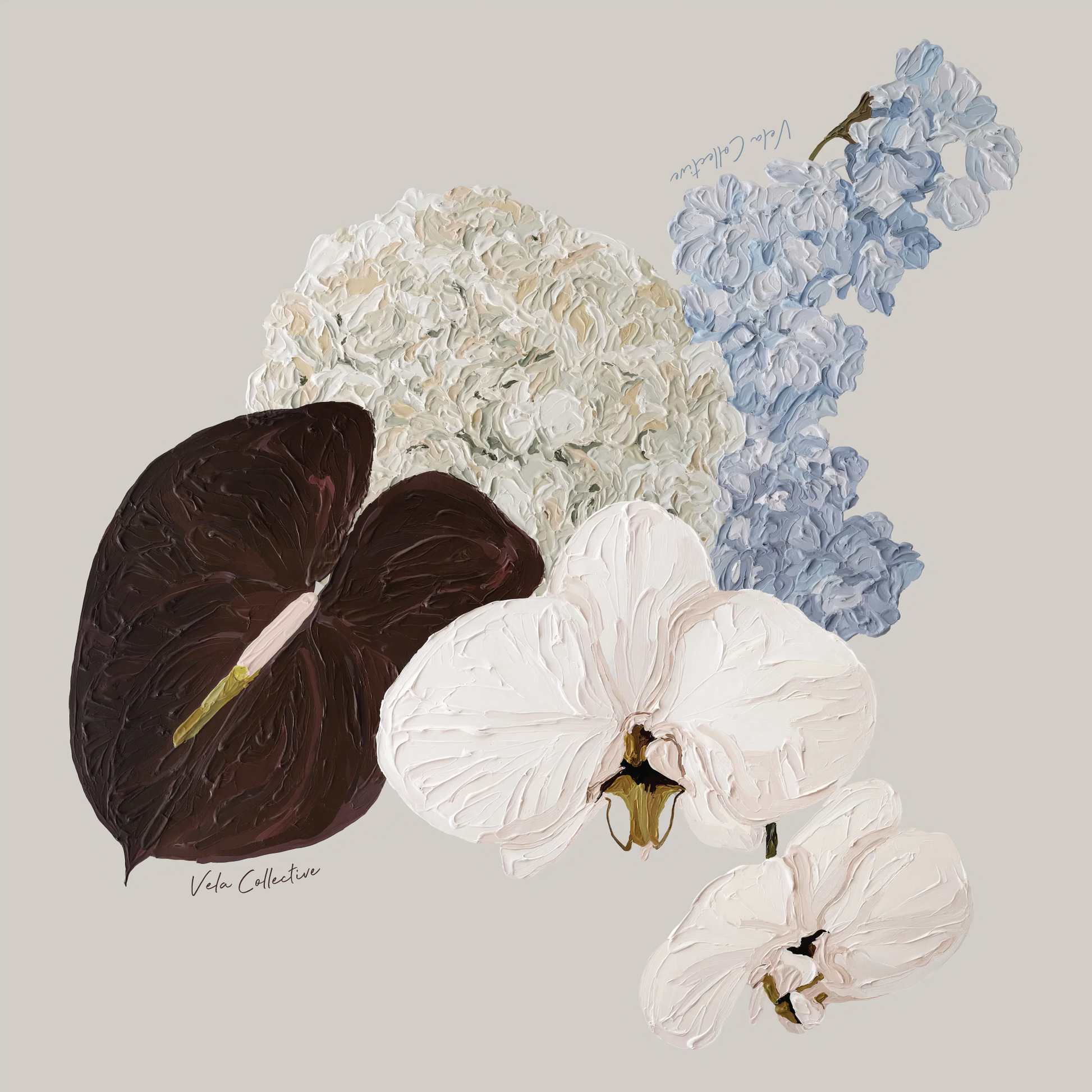 A cool-toned harmony of icy blue hydrangeas, creamy white orchids, and deep chocolate anthuriums.