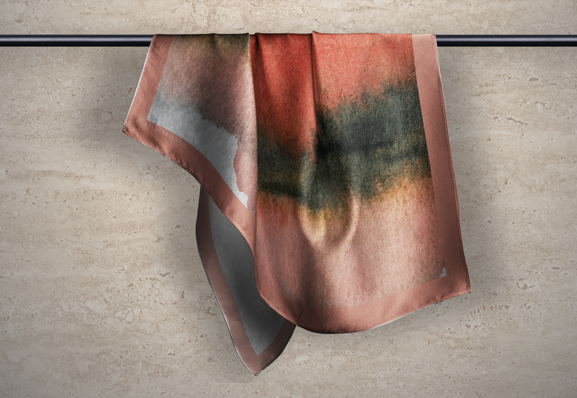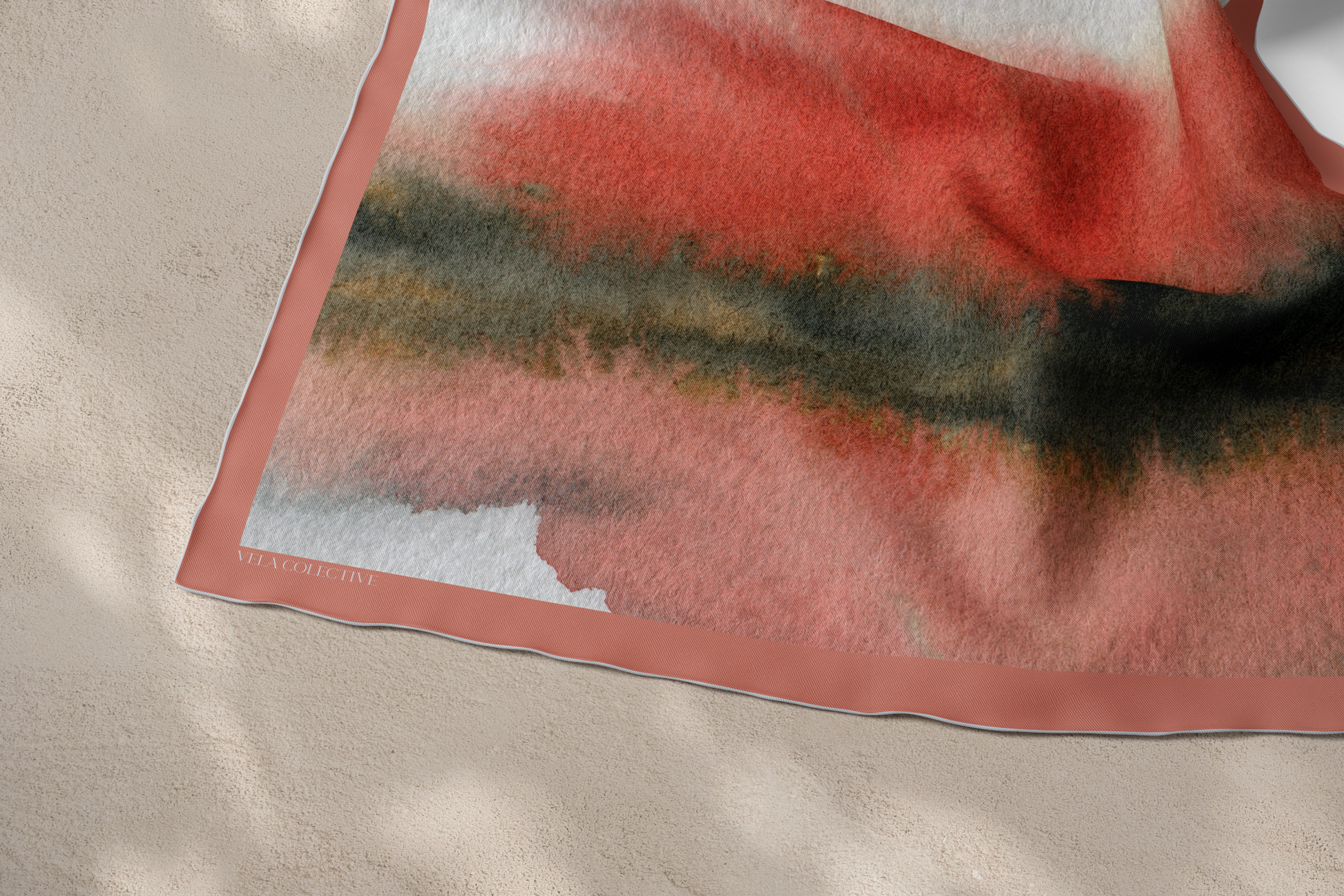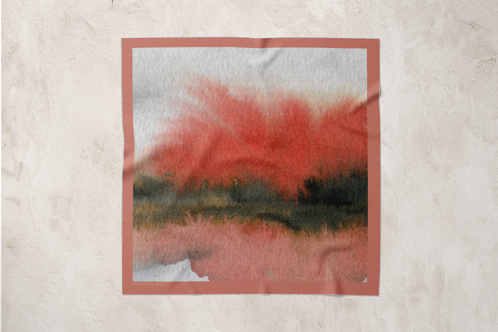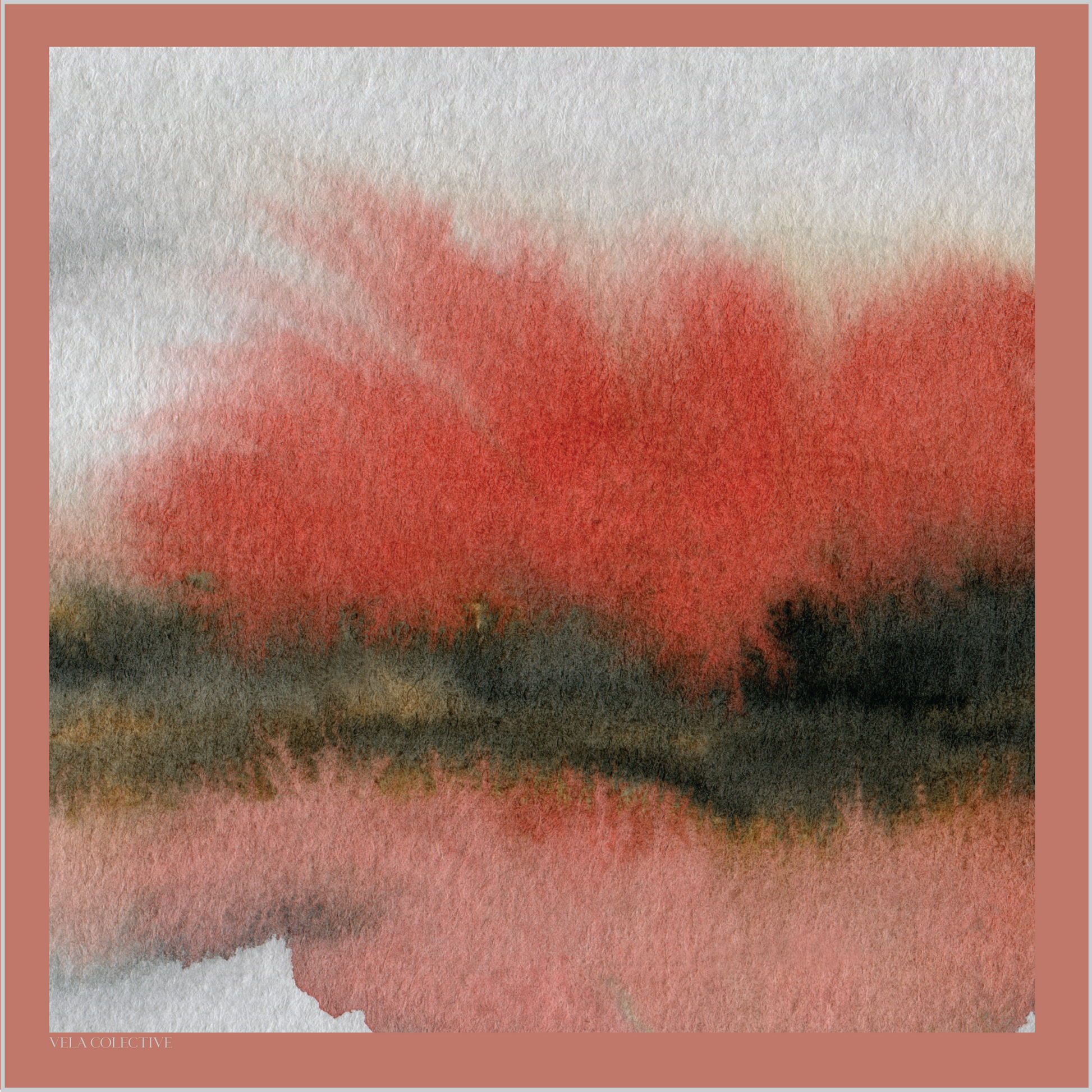 Rich coral-red and soft sage undertones reflect a fiery treeline with a painterly, autumn glow.